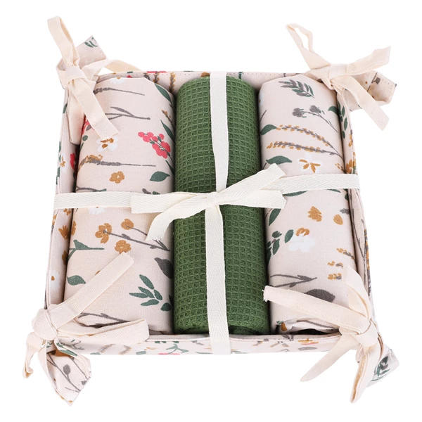 Zestaw ręczników kuchennych z motywem kwiatowym w estetycznym koszyczku ľ elegancja i świeżość w Twojej kuchni Wprowadź do swojej kuchni powiew wiosennej świeżości dzięki zestawowi ręczników kuchennych ozdobionych delikatnym, kwiatowym wzorem. Komplet składa się z trzech ręczników o wymiarach 40 cm x 70 cm, wykonanych w 100% z wysokogatunkowej bawełny, co zapewnia doskonałą chłonność i trwałość w codziennym użytkowaniu. Jeden z ręczników wyróżnia się piękną, głęboką zielenią o waflowej strukturze, a dwa pozostałe zdobi subtelny, kwiatowy motyw, który doskonale wpisuje się w naturalny styl. Motyw kwiatowy ľ świeżość i styl w kuchni Ręczniki w kwiatowy wzór dodają Twojej kuchni lekkości i elegancji. Delikatne, pastelowe kolory kwiatów i zielonych listków na beżowym tle wprowadzają przyjemną atmosferę i stanowią idealne uzupełnienie każdej kuchni, niezależnie od pory roku.