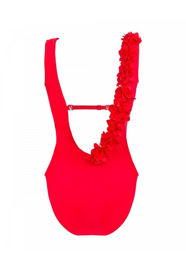 Niezwykle elegancki a zarazem seksowny, jednoczęściowy kostium kąpielowy. Miseczki miękkie,tył z głębokim wycięciem. Przód zdobią kwiatki. które są połączone razem i odpinane.