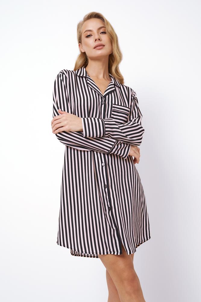 Koszula nocna damska w paski o oversizowym koszulowym fasonie. Zapinana na guziki. Posiada długie rękawy, klasyczny kołnierzyk oraz z jednej strony na wysokości piersi kieszonkę.