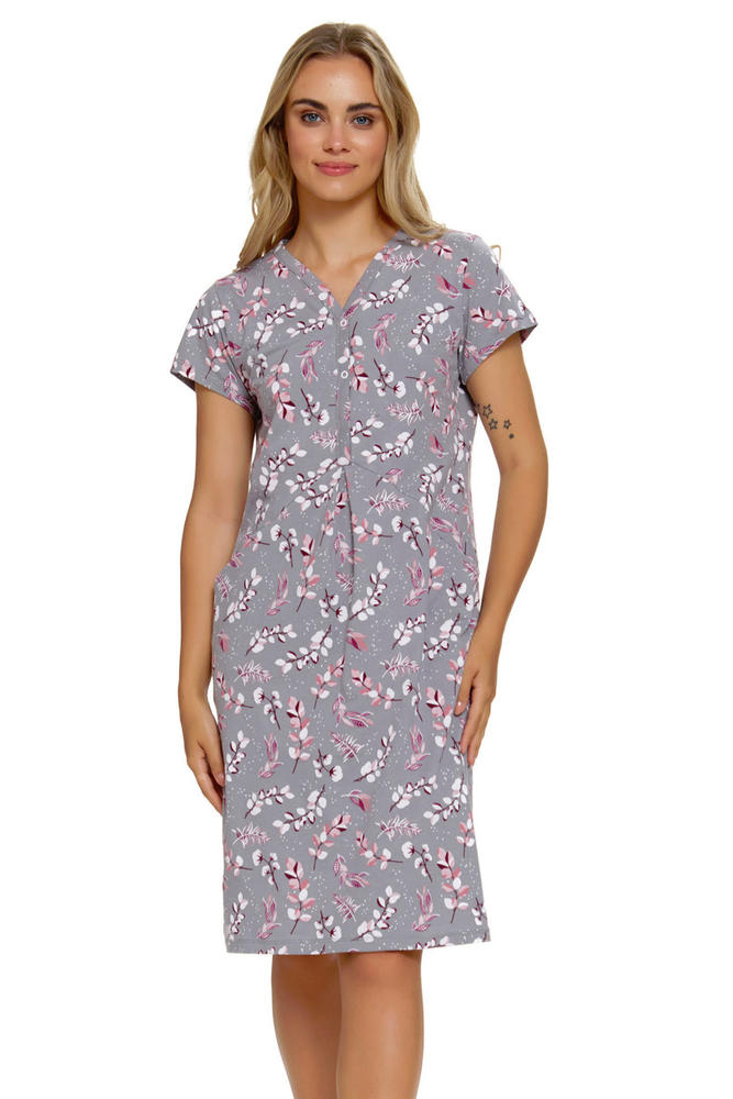 Koszula z krótkim rękawem uszyta z wysokiej jakości bawełny. Dekolt w serek zapinany na napy. Długość koszuli do kolan.