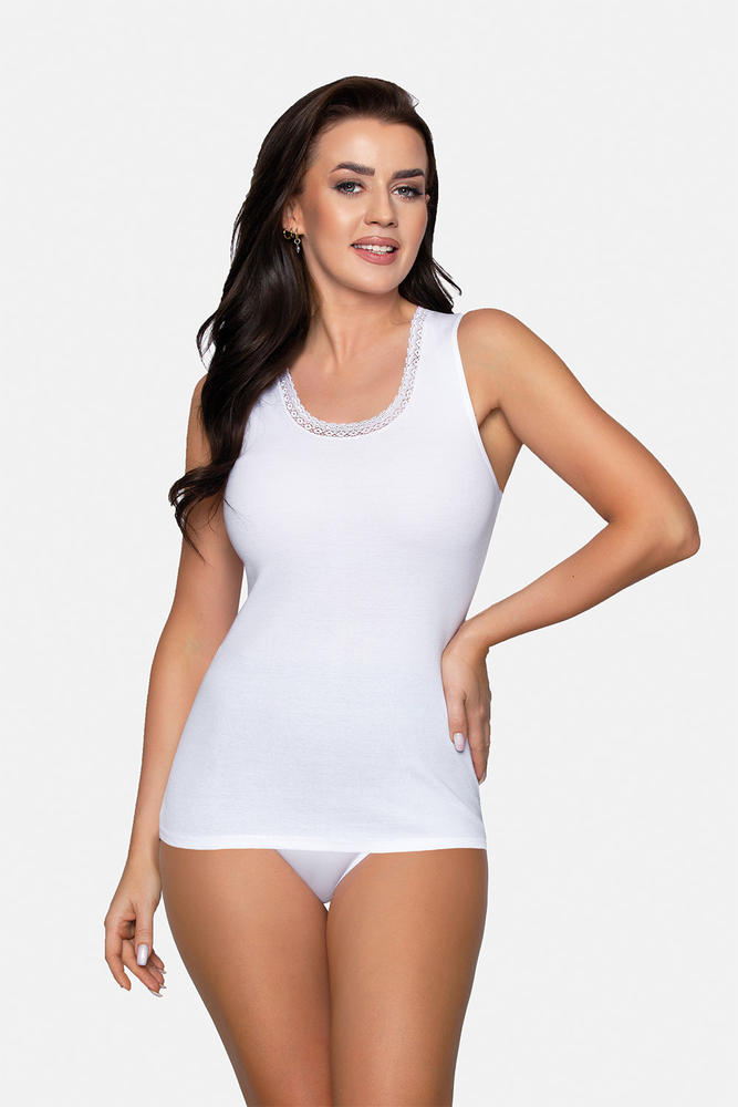 Klasyczna bawełniana koszulka. dekolt okrągły, wykończony jest delikatną koronką. Model bez rękawka, koszulka wykonana jest z przyjemnej w dotyku, wysokiej jakości bawełny.