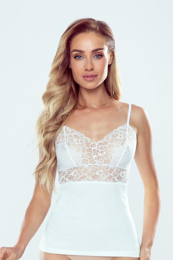 Koszulka na cienkich ramiączkach powstała z połączenia bawełny z koronką. Góra transparentna z zakrywającym sutki motywem koronki. Tył prosty i gładki.