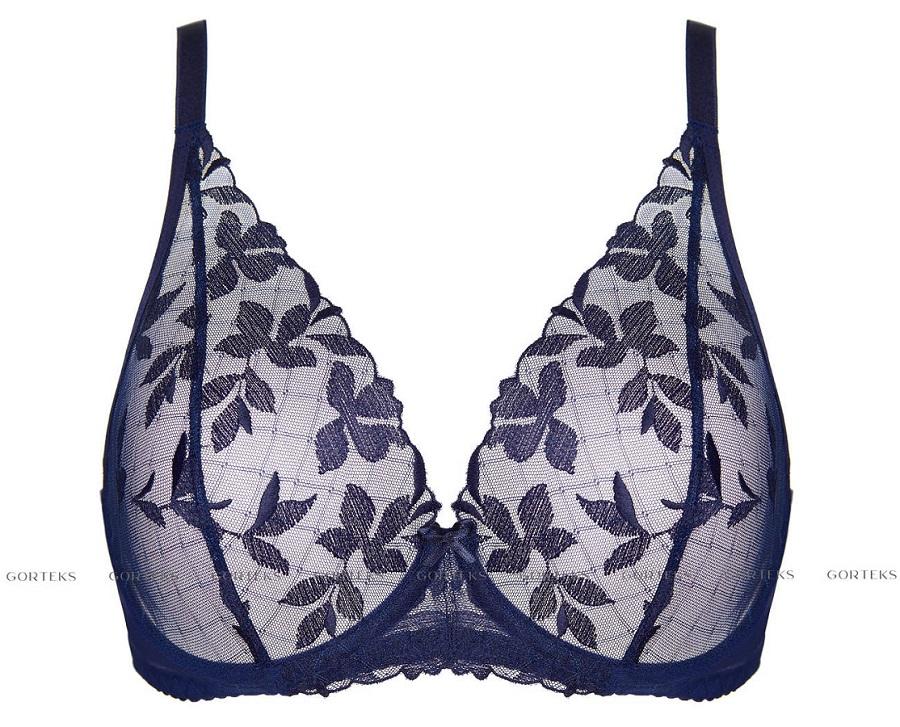 Elegancki miękki biustonosz nadaje piersiom piękny, naturalny kształt. Wykonany z plenu ozdobionego delikatnym haftem o kwiatowym wzorze. Uroku bieliźnie dodaje kokardka umieszczona między miseczkami. Miękkie miseczki na fiszbinach, plecy wykonane z tiulu, regulowane, nieodpinane ramiączka.