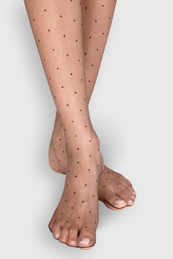 Rajstopy Oh My Dot 13 DEN z linii Timless Look to produkt o ponadczasowym, eleganckim wzorze. Motyw kropek od wielu sezonów w branży modowej uznawany jest za klasyk, który zwyczajnie warto mieć w swojej szafie. Model posiada półmatowe, eleganckie wykończenie, transparentną, wzmocnioną część palcową oraz charakteryzuje go brak zaznaczonej części majtkowej.