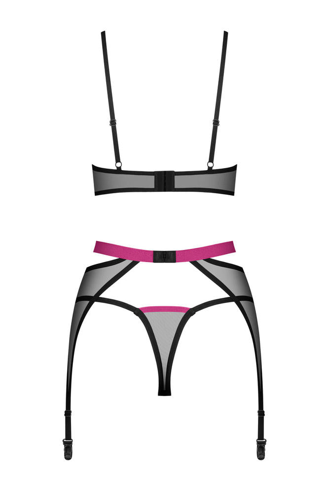 Pas do pończoch, stanik oraz stringi w czarnej, prześwitującej siatki. Ta bielizna wyróżnia się uniwersalnym charakterem oraz nowoczesnymi dodatkami, które przyciągają uwagę. Świetnie nadaje się na romantyczne spotkania.