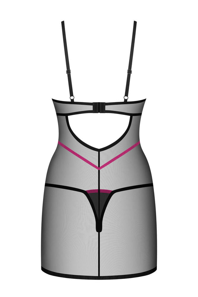 Stringi i koszulka – zmysłowy komplet wykonany z przeźroczystej tkaniny. Delikatna czerń została ozdobiona kolorowymi akcentami, które przyciągają spojrzenie. Ta bielizna doskonale umili najbliższe spotkanie z drugą połówką.