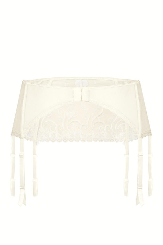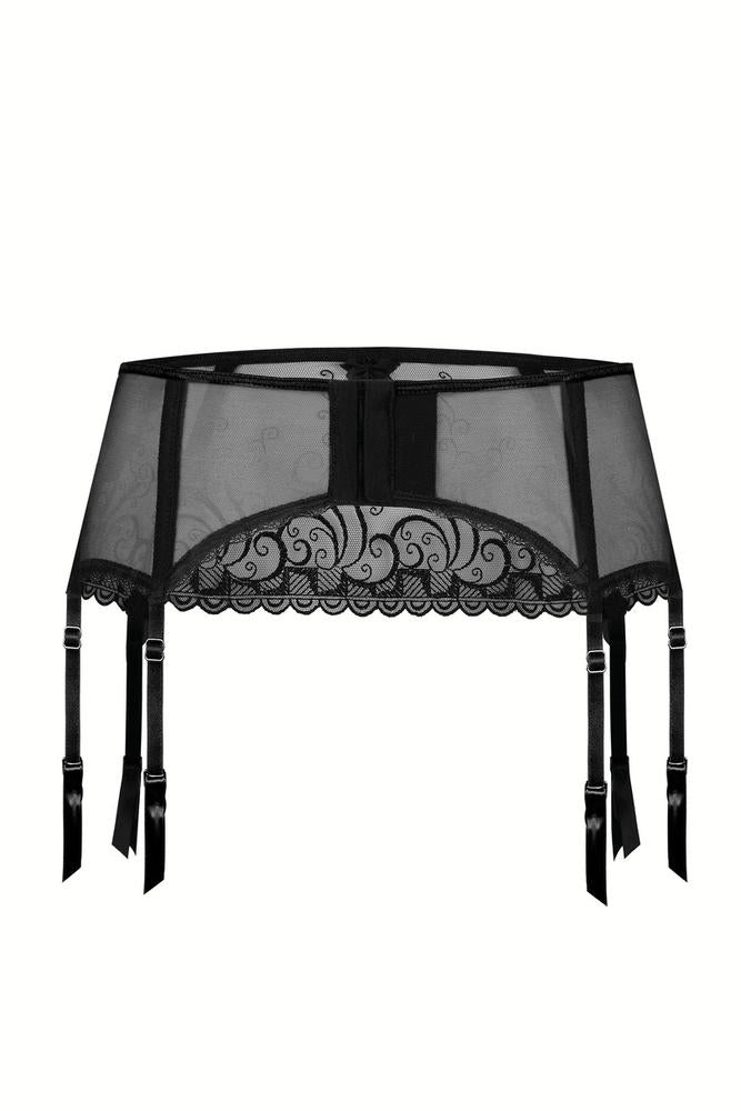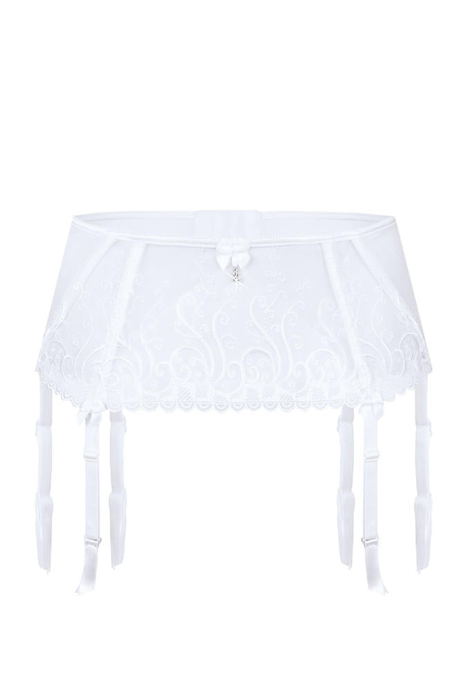 Anuk pas. Podkreślający linię bioder pas, wykonany został z haftu i przezroczystego tiuliku. Na przodzie kokardka połączona z błyszczącą ozdobą. Pikanterii dodaje zastosowanie 6 zapięć trzymających pończochę.