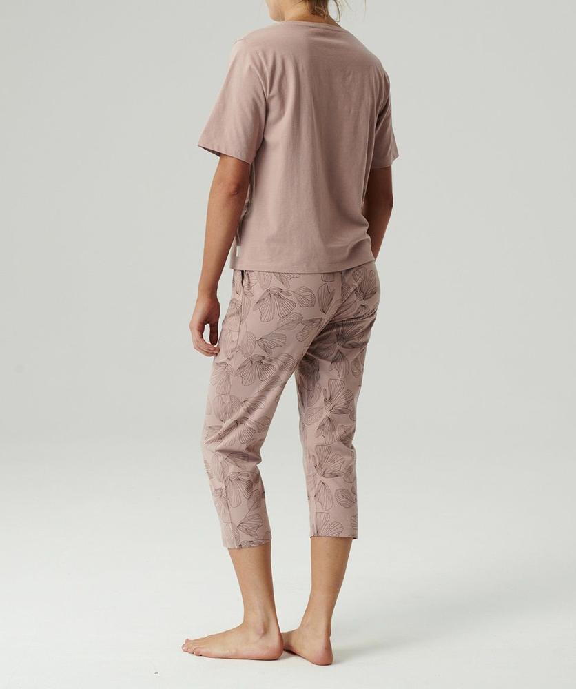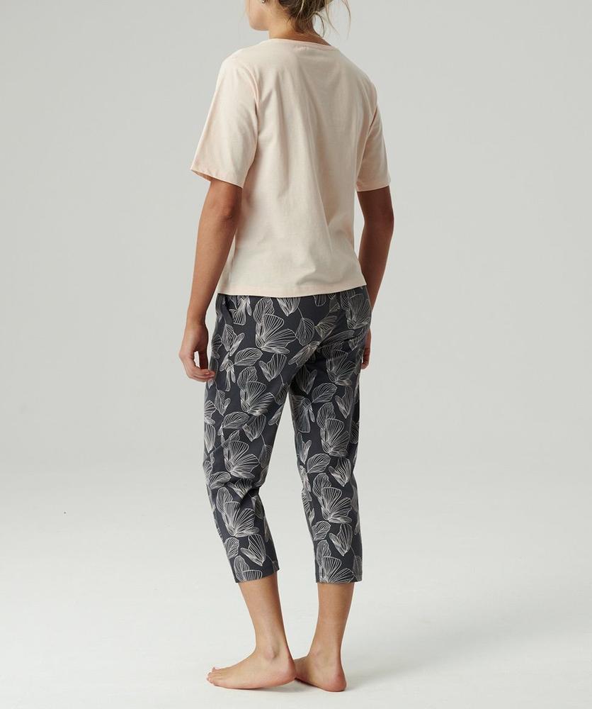 Piżama na wiosenno-letnie noce wykonana z miękkiej i przyjemnej w dotyku bawełny. Koszulka gładka z krótkim rękawem i okrągłym dekoltem. Spodnie w kwiatowy nadruk z kieszeniami po bokach, wiązane w pasie na kokardę.