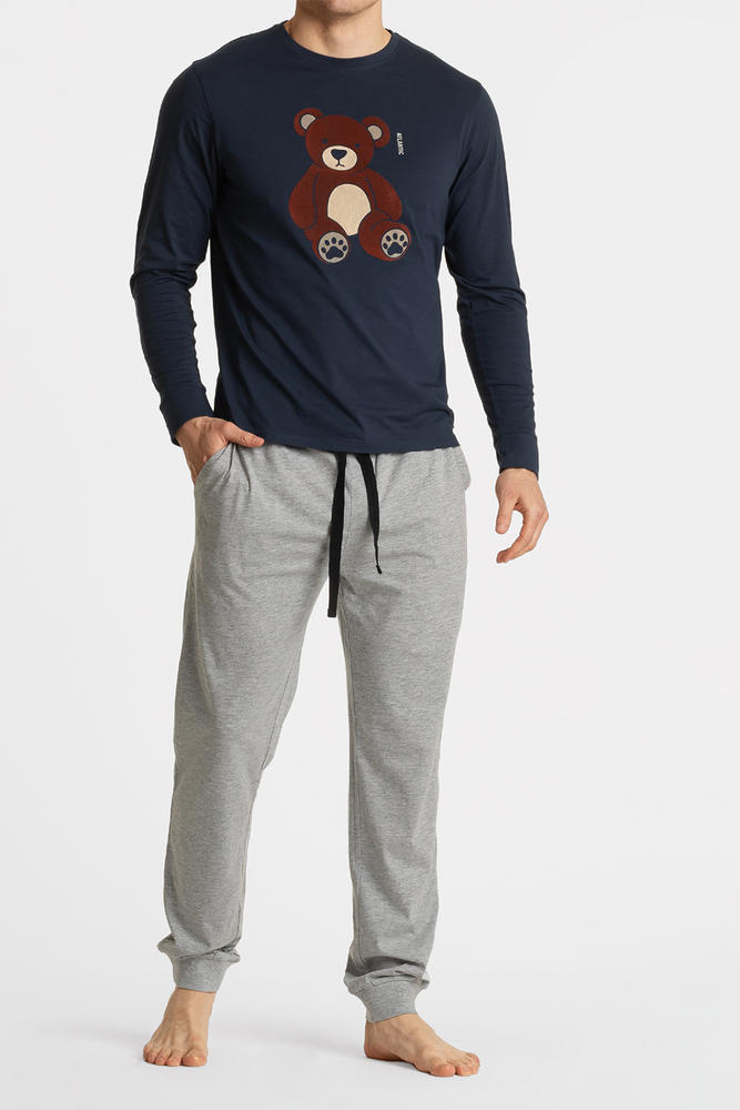 Piżama męska z długim rękawem. Wykonana została z miękkiej i przyjemnej w dotyku bawełny z tzw. efektem brzoskwini („peach effect”. Bluza o kroju delikatnie przylegającym do ciała, spodnie posiadają kieszenie oraz ściągacze