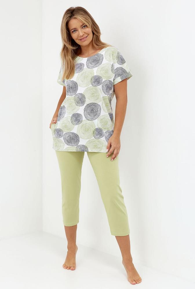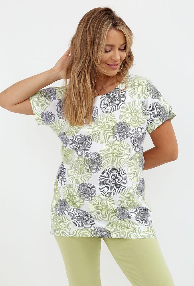 Piżama damska wzorzysta koszulka z krótkim rękawem, dłuższy krój,po bokach wygodne kieszenie do kompletu jednolite spodnie długość 3/4.