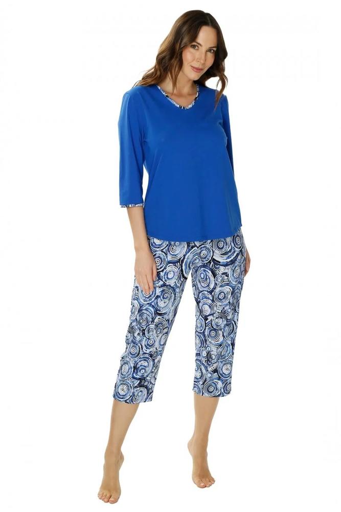 Przewiewna, miękka i przyjemna w dotyku tkanina, góra z rękawem 3/4 i subtelnym dekoltem, spodnie o długości 7/8 z modnym wzorem.Stylowy, kobiecy design.
