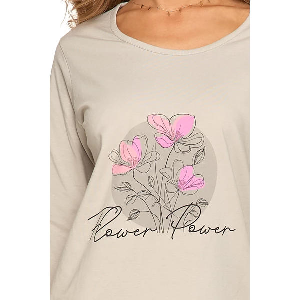 Dodaj swojej wieczornej rutynie odrobinę uroku i wygody dzięki tej bawełnianej piżamie damskiej z rękawem 3/4. Bluzka w delikatnym, beżowym odcieniu została ozdobiona romantycznym nadrukiem kwiatów i napisem äFlower Powerö, który symbolizuje kobiecą siłę i subtelność. Dopasowane spodnie o długości 3/4 z elastyczną talią pokryte są kwiatowym wzorem w odcieniach różu i czerni, tworząc spójną i stylową całość. Miękka bawełna pozwala skórze oddychać, zapewniając komfort przez całą noc. Idealna na spokojne wieczory w domowym zaciszu i leniwe poranki z filiżanką kawy.