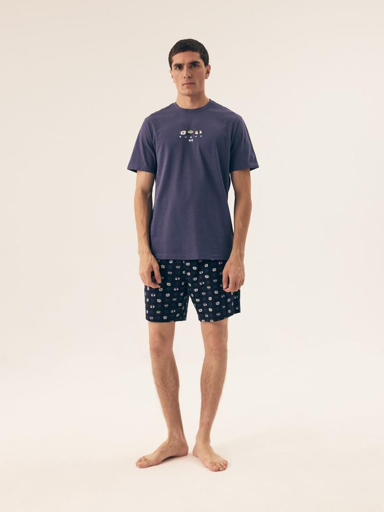 Piżama męska z wysokiej jakości bawełny. Koszulka z krótkim rękawem, półokrągłym dekoltem i niewielką grafiką w postaci kawałków sushi i napisu. Spodenki krótkie, w małe, gęsto umieszczone kawałeczki sushi, w pasie gumka.