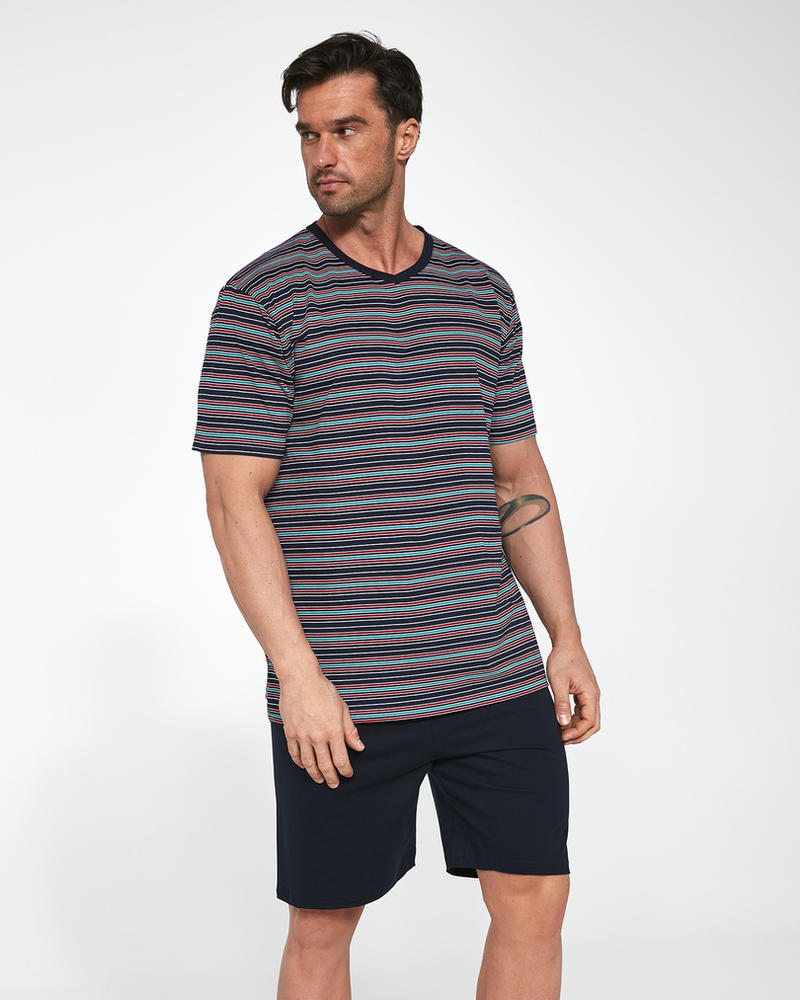 Piżama męska uszyta z wyjątkowo miękkiej bawełny. Koszulka w paski, z krótkim rękawem, dekolt półokrągły. Do kompletu jednolite, krótkie spodenki. Pakowana w pudełko.