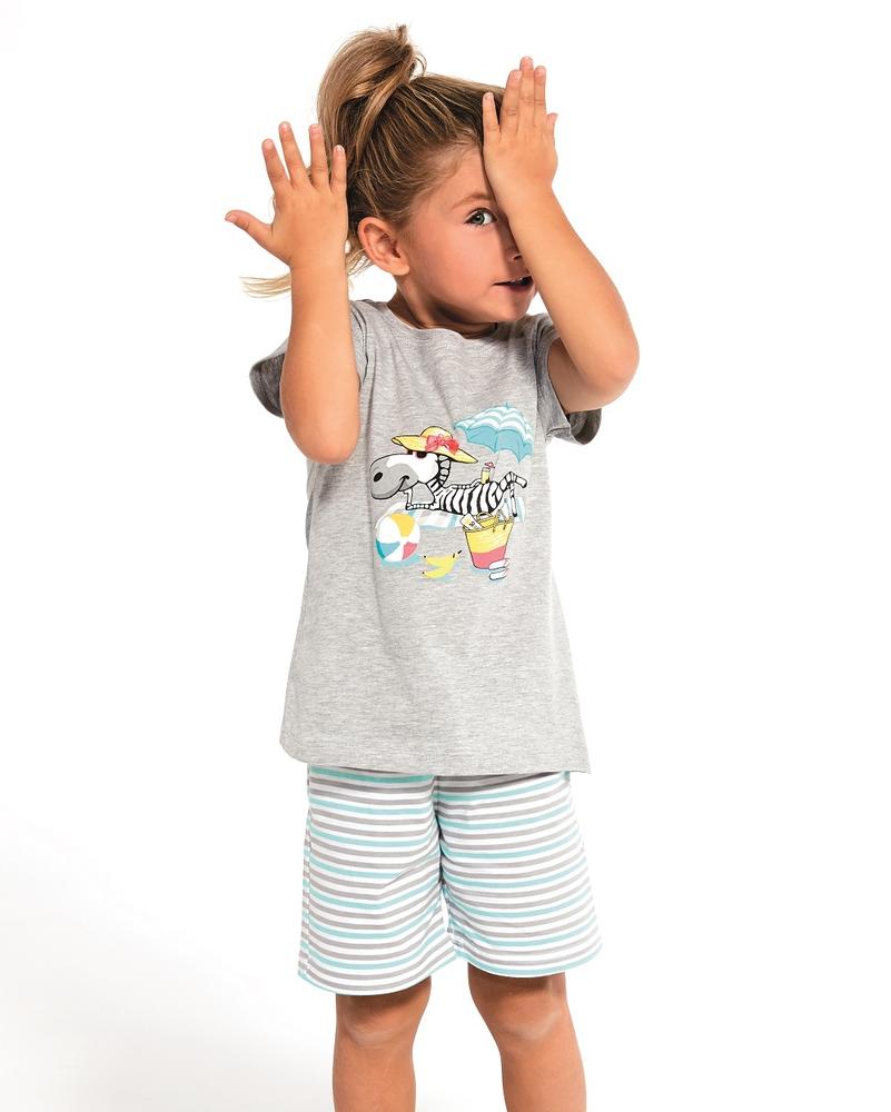 Luźna piżamka dziewczęca, idealna na lato. Dwuczęściowa piżama dla dziewczynki została wykonana z wysokiej jakości materiałów. Krótki rękaw i krótkie spodenki zapewniają pełen komfort snu podczas gorących nocy. Luźną koszulkę zdobi zabawny nadruk zebry. Do kompletu krótkie spodenki w paski, kolorystycznie idealnie pasujące do góry piżamy.