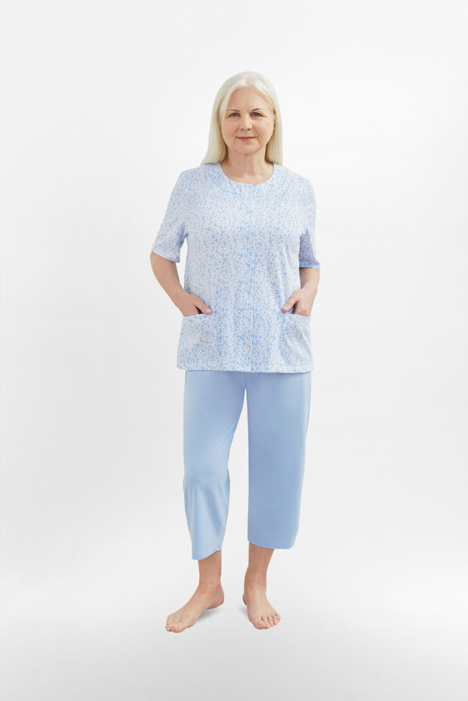 Piżama bawełniana z kieszeniami, zapinana na guziki, spodnie gładkie, w pasie komfortowa gumka, Bluzka krótki rękaw, spodnie długość 3/4.