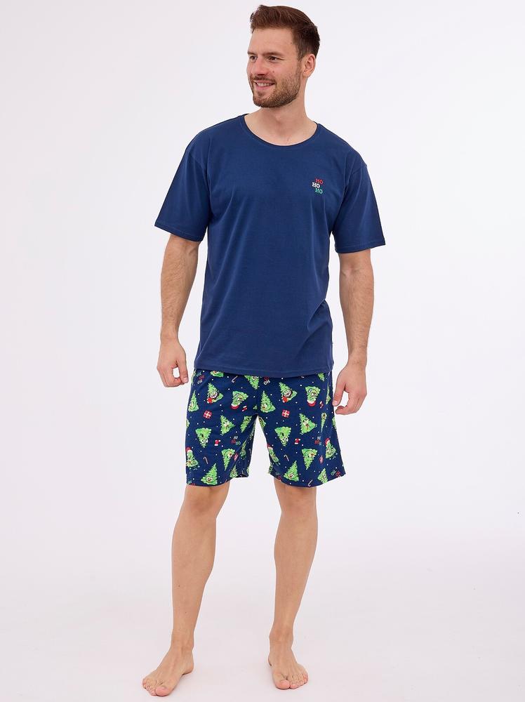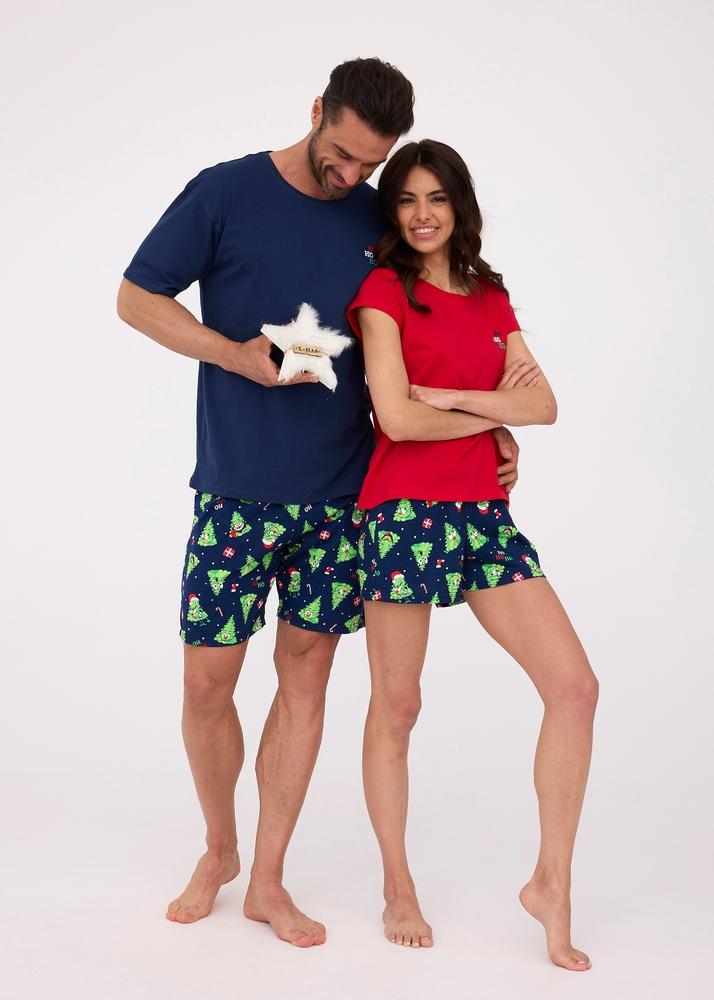 Piżama męska wysokiej jakości bawełna, świąteczne motywy, koszulka z krótkim rękawem, dekolt okrągły na piersi delikatny nadruk, spodenki krótkie, wzór w choinki w pasie wygodna guma obszyta bawełną.