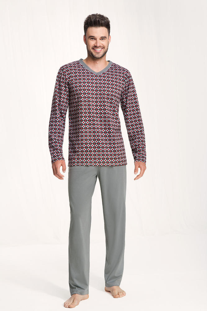 Piżama męska z wysokiej jakości bawełny. Wzorzysta bluza z długim rękawem, dekolt w serek. Spodnie długie, jednolite nawiązujące kolorystycznie do całości piżamy. Powyższe kolory występują w różnych wzorach.