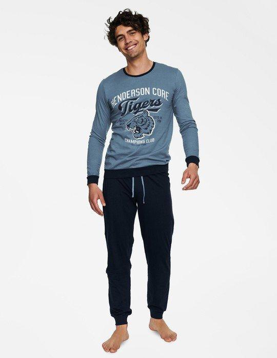 Dwuczęściowa piżama męska HENDERSON BURN to wygodny komplet do spania, który składa się z prostej koszulki z długim rękawem i okrągłym dekoltem oraz wygodnych, długich spodni. Mankiety, dół koszuli oraz nogawki wykończone są szerokim ściągaczem.