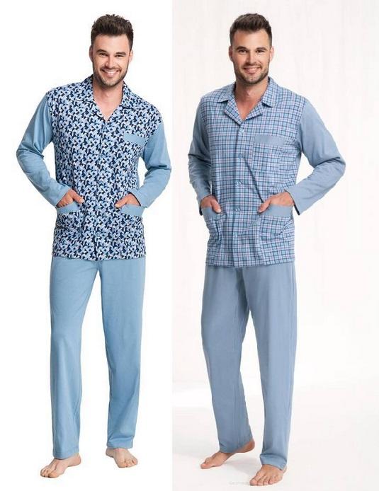 Piżama męska uszyta z wyjątkowo miękkiej bawełny. Bluzka w kratę, zapinana na guziki z kołnierzykiem i z kieszeniami. Spodnie długie, jednolite. Kolory występują w różnych wzorach.