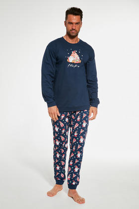 Piżama męska uszyta z wysokiej jakości miękkiej bawełny. Koszulka z długim rękawem, przód ozdobiony kolorowym nadrukiem.Do kompletu długie wzorzyste spodnie . Dekolt, mankiety oraz dół koszulki z nogawki zakończone wygodnym ściągaczem. Piżamka pakowana w pudełko.
