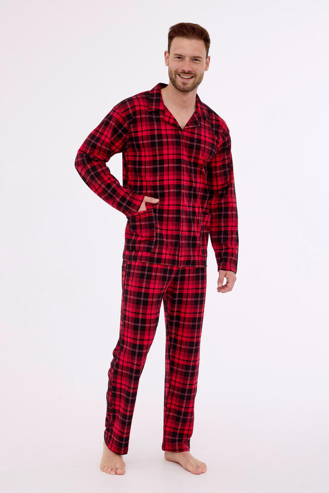 Klasyczna piżama męska z długim rękawem i kołnierzykiem, rozpinana. Na wysokości bioder kieszenie. Do kompletu jednolite spodnie z prostymi długimi nogawkami. Piżama pakowana w pudełko.
