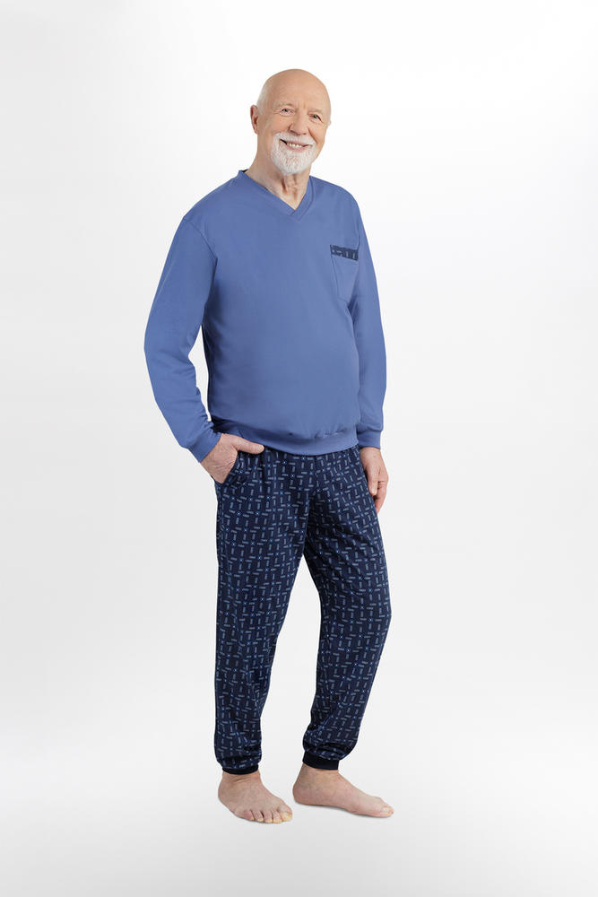 Piżama KAROL II 408. Bluzka długi rękaw, z kieszenią. Dekolt w serek. Rękawy oraz dół bluzki wykończone ściągaczem. Spodnie piżamy długie, z dwiema kieszeniami, z dzianiny drukowanej. Elastyczna guma w pasie zapewnia wygodę oraz uniwersalność rozmiaru. Produkt wykonany starannie, z bawełny wysokiej jakości, odpowiadającej standardowi Oeko – Tex.