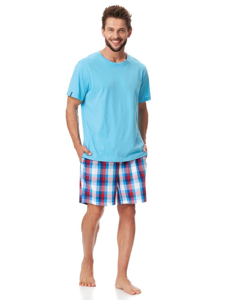 Piżama męska z krótkim rękawem. Góra wykonana z gładkiej dzianiny bawełnianej, z okrągłym dekoltem. Do kompletu krótkie spodenki bawełniane w kratę, z komfortową gumą oraz troczkiem w pasie. Spodenki posiadają praktyczne kieszenie. Całość w sprawdzonym, wygodnym kroju.