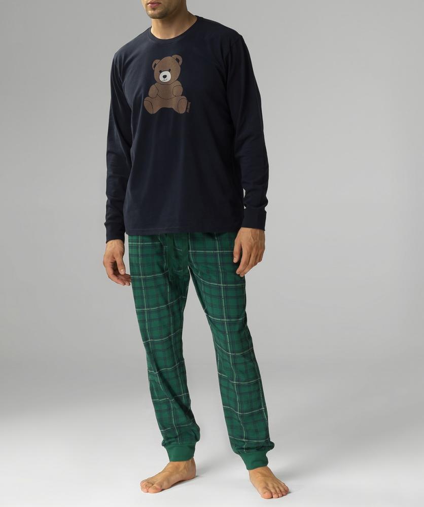 Piżama Męska NMP-377 miś na bluzie, spodnie w kratę dzianina z efektem pech effect (pokryta puszystymi włoskami, w dotyku przypomina skórkę brzoskwini),