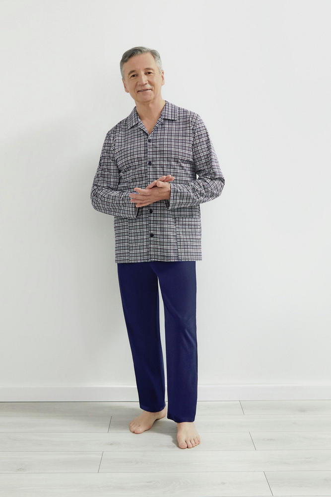 Dwuczęściowa piżama męska Antoni II 403, z rozpinaną koszulą w kratę i gładkimi spodniami.