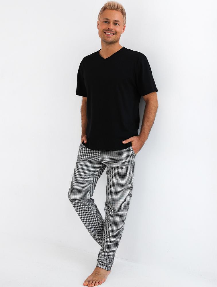 Bawełniana piżama męska, czarna koszulka z krótkim rękawem, dekolt w szpic, spodnie długie w kratkę, po bokach wsuwane kieszenie, w pasie wygodna gumka.