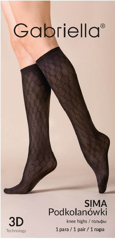 Podkolanówki damskie Sima zdobią nogi wyrazistym, geometrycznym wzorem. Cienki ściągacz nie tylko utrzymuje czarne podkolanówki damskie na właściwym miejscu, ale także estetycznie prezentuje się na nodze.