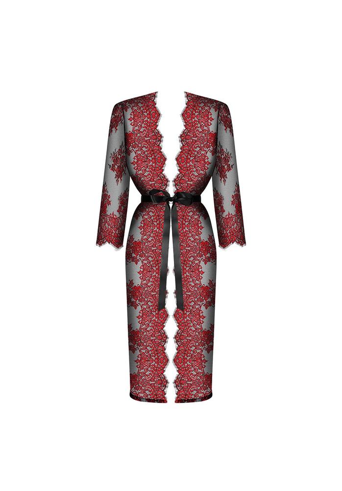 Peniuar w pięknej kombinacji czerni oraz czerwieni z delikatnym, kwiatowym wzorem koronki. Satynowe wiązanie w talii oraz kokardka z tyłu to idealne połączenie.