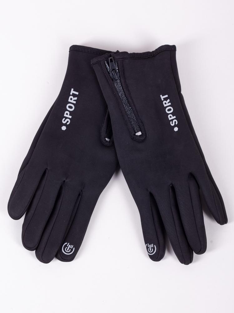 Praktyczne, męskie rękawiczki. W kolorze czarnym. Idealne na zimę – zapewnią komfort i ciepło. Na wierzchniej części znajduje się ekspres i napis „SPORT”.