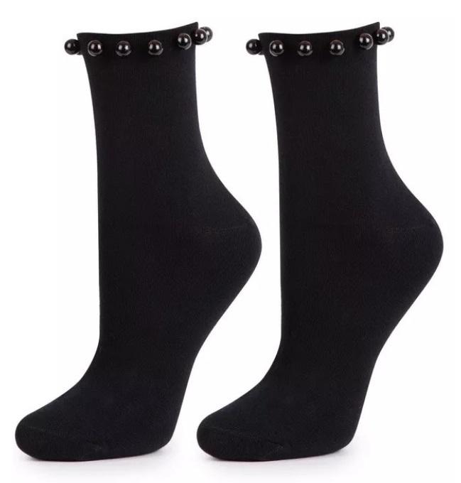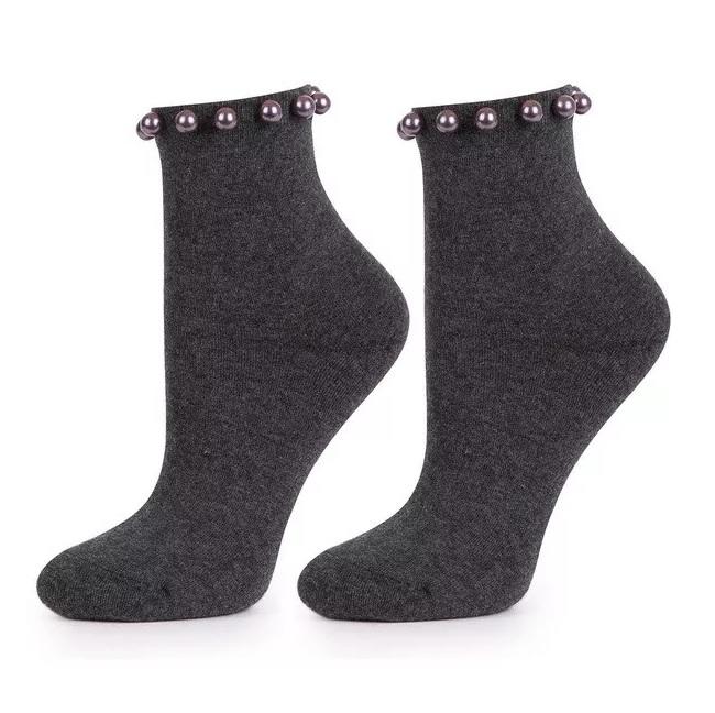 Skarpety damskie ozdobione wokół ściągacza perełkami. Są one niezwykłym połączeniem klasyki i elegancji. Idealne na prezent. Skład: 75% bawełna, 20% poliester, 5% elastan.