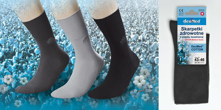 Skarpetki zdrowotne z przędzy bawełnianej. Specjalna konstrukcja cholewki i niewielka domieszka nowoczesnego włókna Lycra® w całym wyrobie powodują idealne bezuciskowe przyleganie do nóg i maksymalną elastyczność - nietamowanie przepływu krwi i komfort nawet dla opuchniętych nóg. Bezszwowe łączenie nad palcami gwarantuje wygodę osobom o bardzo wrażliwych stopach, np. stopach cukrzycowych. Dzięki trwałemu działaniu apretury antybakteryjnej i antygrzybiczej (na szwajcarskiej licencji Sanitized®) skarpetki hamują rozwój mikrobów i zapobiegają jednocześnie przykremu zapachowi podczas użytkowania. Do produkcji skarpetek jest używana czysta bawełna - naturalna przędza najwyższej jakości.