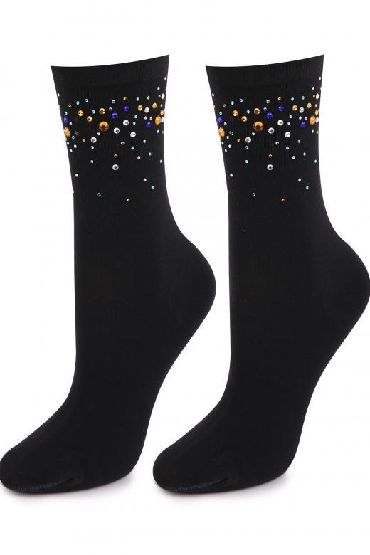 Skarpety damskie ozdobione srebrnymi diamencikami różnej wielkości. Są one niezwykłym połączeniem klasyki i elegancji. Idealne na prezent. Skład: 80% bawełna, 15% poliester, 5% elastan.