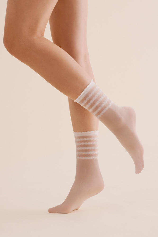 Skarpetki damskie Lora wykonane są z cienkiej dzianiny, która dopasowuje się idealnie do kształtu stopy. Bezuciskowy ściągacz utrzymuje damskie skarpetki na właściwym miejscu. Cienkie skarpetki wzorzyste Lora dostępne są w trzech wariantach kolorystycznych: białe skarpetki (bianco), czarne skarpetki (nero) oraz beżowe skarpetki (beige). ✔ damskie skarpetki