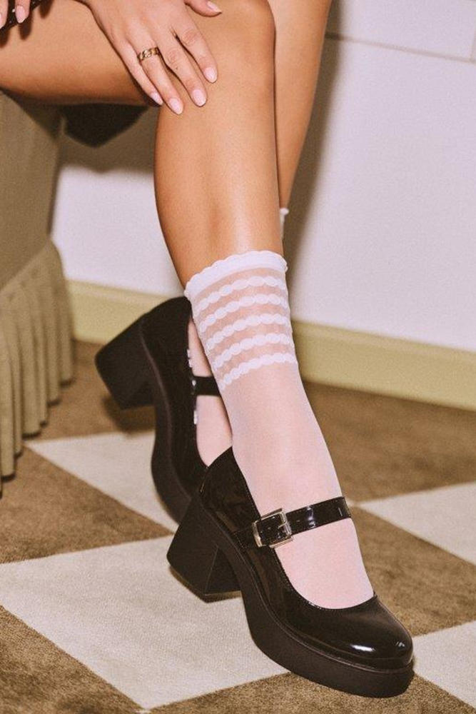 Cienkie, damskie skarpetki Lora to modny dodatek do codziennych stylizacji. Stylowy, ponadczasowy wzór w kropki łączy się w całość tworząc subtelne, delikatne pasy oplatające nogę tuż nad kostką. Ozdobny ściągacz inspirowany falbanką dopełnia stylizację dodając jej dziewczęcego uroku.
