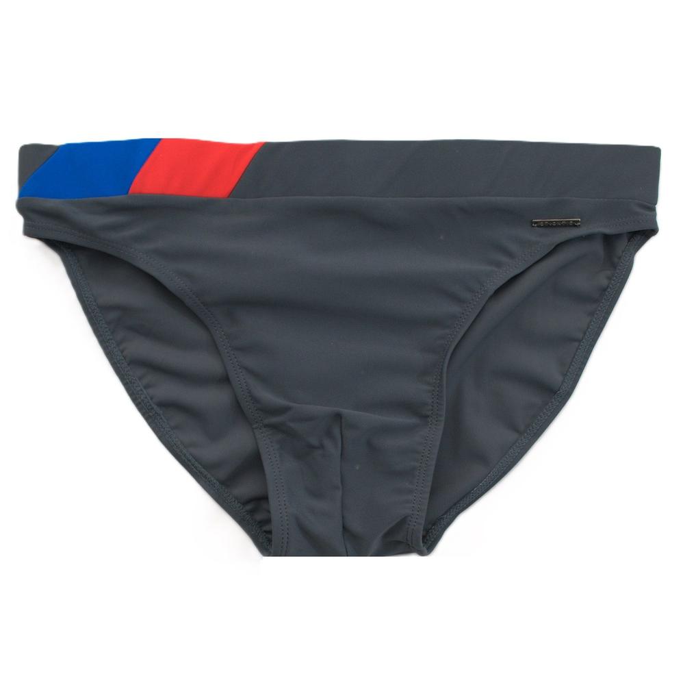Slipy kąpielowe w jednolitym kolorze z wyraźnie zaznaczoną, szeroką gumką u góry wraz z ozdobnymi kolorowymi akcentami na ściągaczu. Kąpielówki posiadają wewnątrz ściągacza sznurek, umożliwiający regulację w pasie.