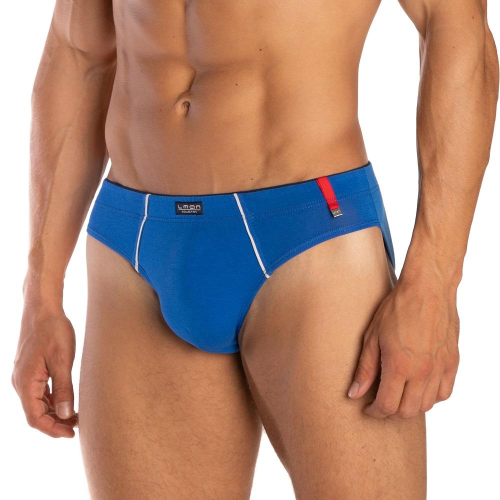 Wygodne slipy męskie wykonane z naturalnej bawełny. Jedna sztuka w kratkę, druga sztuka gładka w kolorze niebieskim. Z przodu zawieszka z logo. W pasie podszyte granatową gumą.