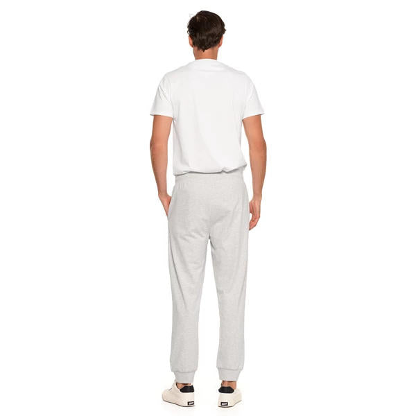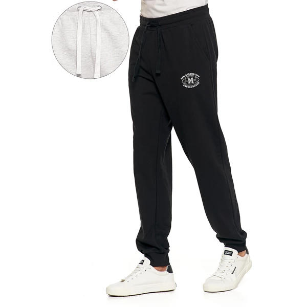 Klasyczne męskie spodnie dresowe w stylu joggerów, które łączą wygodę z nowoczesnym designem. Spodnie zostały wykonane z wysokiej jakości bawełny z domieszką, co zapewnia miękkość, przewiewność i trwałość. Dzięki regulacji w pasie na sznurek, spodnie idealnie dopasowują się do sylwetki, oferując komfort noszenia przez cały dzień. Spodnie posiadają dwie praktyczne kieszenie z przodu, które są idealne do przechowywania drobnych przedmiotów. Wykończenie ściągaczami na dole nogawek podkreśla ich sportowy charakter, a gumowy, minimalistyczny nadruk na lewej nogawce dodaje nowoczesnego akcentu, czyniąc te spodnie idealnym wyborem na co dzień.