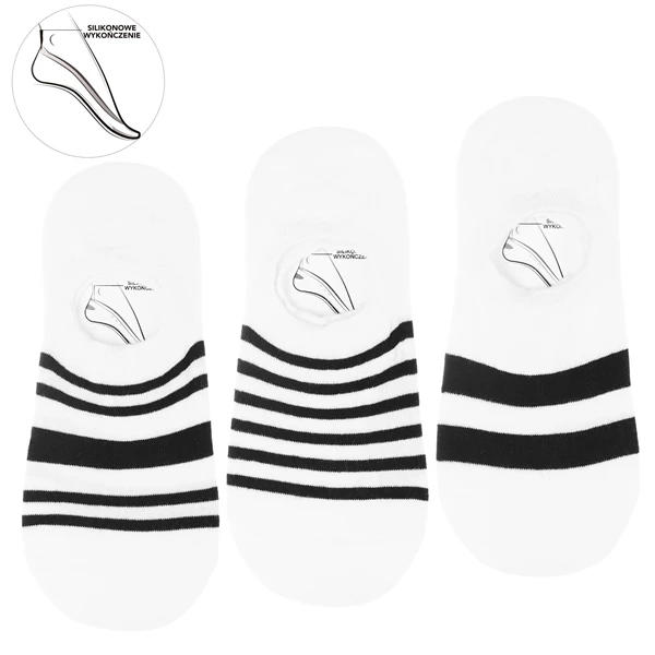 Silikonowe wykończenie na pięcie zapobiega zsuwaniu się skarpet, dzięki czemu idealnie dopasowują się do stopy i pozostają na miejscu nawet przy intensywnym ruchu. Ich niski fason sprawia, że są doskonałym wyborem do sneakersów, mokasynów czy balerinek, pozostając niemal niewidocznymi pod obuwiem. Kontrastowe czarne paski dodają im charakteru, dzięki czemu pasują zarówno do sportowych, jak i casualowych stylizacji.