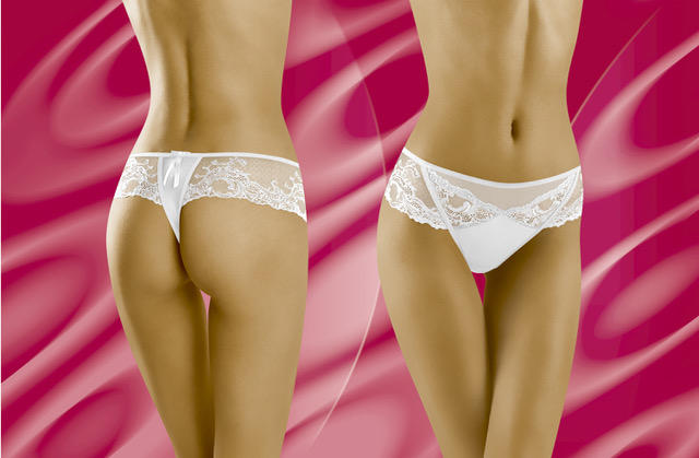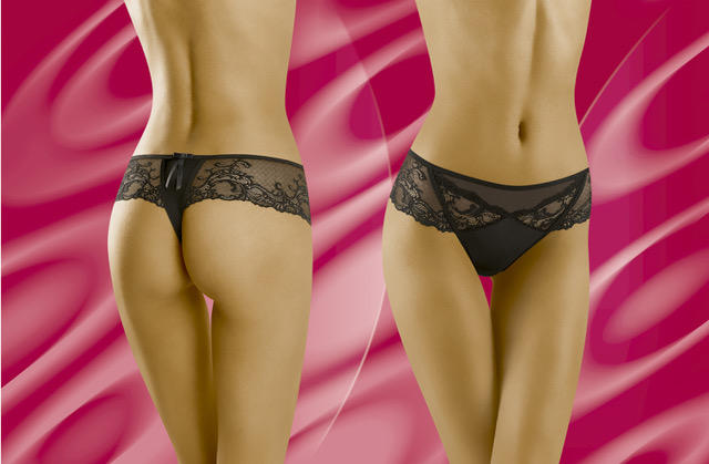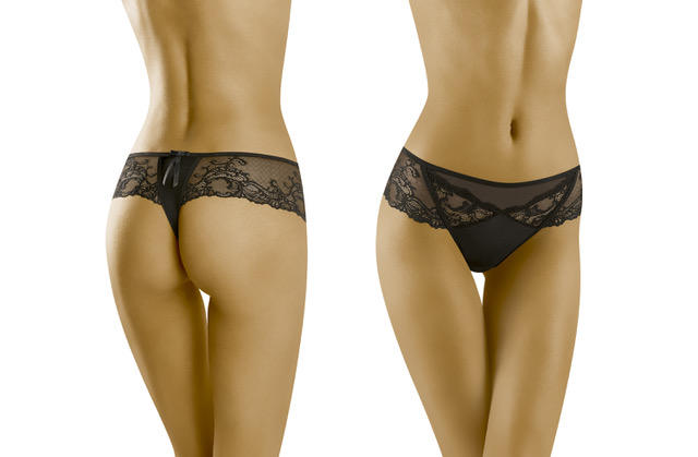 Efektowne stringo-szorty bogato zdobione koronką.