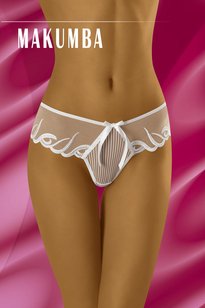Seksowne stringo-szorty w całości wykonane z haftowanego tiulu . Przód zdobiony atłasową kokardą. Idealne na lato. Skład: Poliamid 83%, Elastan 17%.