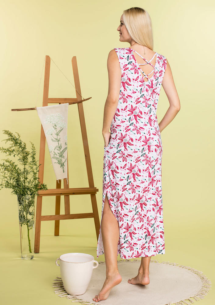 Długa, luźna sukienka w literę A, z przewiewnymi rozcięciami po bokach. Wyjątkowo delikatna dzianina bambusowa dająca naszemu ciału uczucie chłodu. Kwiatowy rysunek jeżówki z naszych ogrodów.