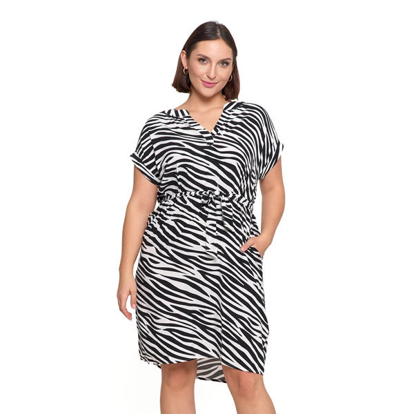 Lekka, komfortowa sukienka o prostym fasonie, która łączy elegancję z codzienną wygodą. rt noszenia nawet w ciepłe dni.Dekolt w kształcie litery V subtelnie podkreśla linię szyi, dodając całości kobiecego charakteru. Krótkie rękawy z delikatnie podwiniętym wykończeniem zapewniają swobodę ruchów i lekkość stylizacji. W talii znajduje się wiązanie w postaci materiałowego paska, które pozwala dopasować sukienkę do sylwetki i podkreślić talię.