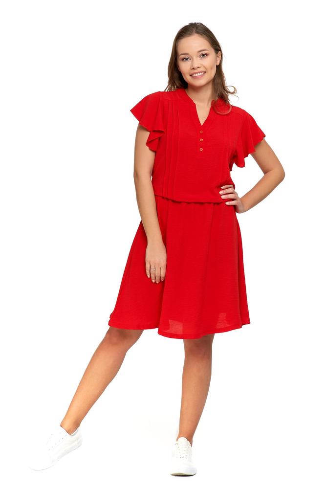 Sukienka damska z krótkim rękawkiem, wykończona efektowna falbanka, długość przed kolano.