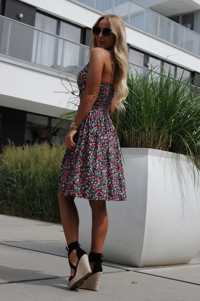 Zwiewna, mini sukienka o dekolcie w serek. Modny kwiecisty print jakim jest przepełniona sprawia, że aż czuć powiew lata. W pasie posiada ściągacz uwydatniający talię oraz regulowane ramiączka, dzięki którym wysokość dekoltu można dopasować do swoich preferencji. Taliowana oraz przepełniona letnimi kolorami - pokocha ją każda kobieta w letnie upały.