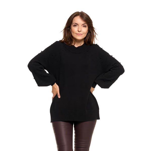 Elegancki damski sweter z ozdobnymi perełkami i szerokimi rękawami to idealny wybór dla kobiet, które cenią sobie styl i wygodę. Wykonany z wysokiej jakości wiskozy z domieszkami, sweter zapewnia wyjątkowy komfort noszenia oraz luźne dopasowanie do sylwetki. Dzięki lekkiej i miękkiej dzianinie, doskonale sprawdzi się zarówno na co dzień, jak i na bardziej wyjątkowe okazje. Sweter wyróżniają piękne, dekoracyjne perełki, które dodają mu szyku i delikatności, podkreślając subtelny, kobiecy charakter. Szerokie, bufiaste rękawy z elastycznym mankietem to nie tylko stylowy akcent, ale również dodatkowy element zapewniający komfort i swobodę ruchów.